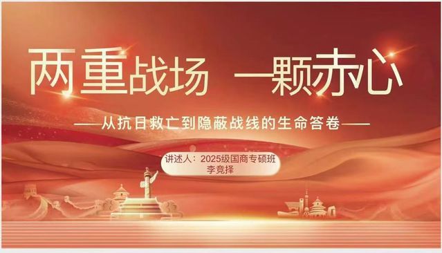 2025级国际商务专业的李竞择同学在线上以“两重战场,一颗赤心”为题,娓娓道来了朱枫这位女性革命者滚烫的信仰。通过李竞择的叙述,我们认识了这位抗日战争和解放战争时期用两件物件书写革命人生、用生命守护山河统一的女性。两件物件中的赤子之心值得我们永远传承,鼓舞着我们把“念想”变成“行动”,用“小我”托起“大我”。