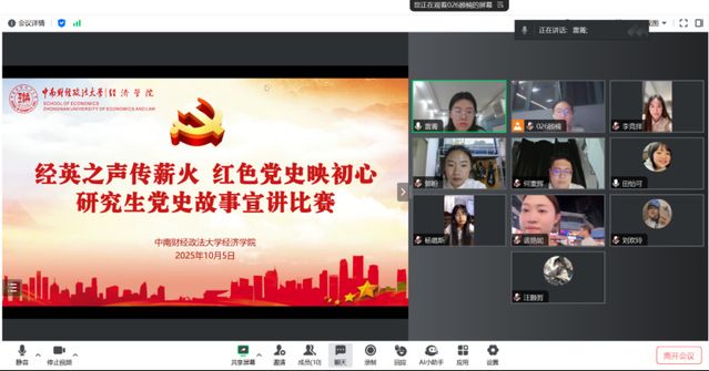 2023级经济思想史专业的詹敬彬同学以“基于电影《731》的党史宣讲”为题,以电影为切口深刻讲述了“抗战胜利是无数先烈用鲜血换来的”,激励我们坚定传承抗战精神的决心;2025级西方经济学专业的马晓慧同学以“传送曙光的电波”为题,为我们带来了抗战革命英雄李白同志用生命传送电报,用沉默面对酷刑,以自我牺牲换来千万人的生命的悲壮故事;2025级世界经济专业李慧孜同学以“两弹元勋邓稼先”为题讲述了邓稼先先生用一生践行“爱国、励志、求真、力行”的誓言和共产党员的担当,激励我们把个人理想融入民族复兴的洪流。
