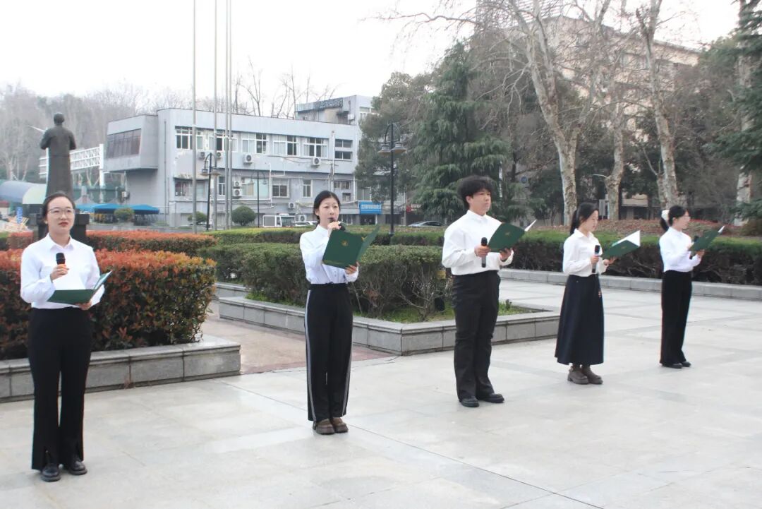 朗诵环节,学生代表毕轩齐、王春蕾、管雨晴、王佳琦、石宇欣带来诗歌朗诵《读中国》。他们用激昂的语调、饱满的情感,带来深情的朗诵。从甲骨文的沧桑到唐诗宋词的悠远,从四大发明的奇迹到“一带一路”的开放,带领全场师生在文字中触摸中华文明的脉搏。“读中国,你会发自肺腑地向着东方喊——我爱你,中国!”铿锵的誓言在广场上回荡,深深感染了全场师生。