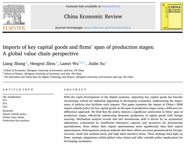 在发表于China Economic Review的论文中,研究团队基于全球价值链视角,以中国于2008年初实施的进口贴息政策为准自然实验,构建双重差分模型,考察了关键资本品进口增加对企业所承担生产阶段跨度的影响及实现机制。实证结果表明,关键资本品进口补贴在直接降低企业获取先进资本品成本的同时,也导致企业生产阶段跨度收缩,并呈现出向下游转移的特征。该研究认为相关政策不仅应关注先进资本品的进口,更应重视企业对其所蕴含技术的吸收与转化能力,这对于提升产业链安全、增强自主发展能力具有重要的现实意义。