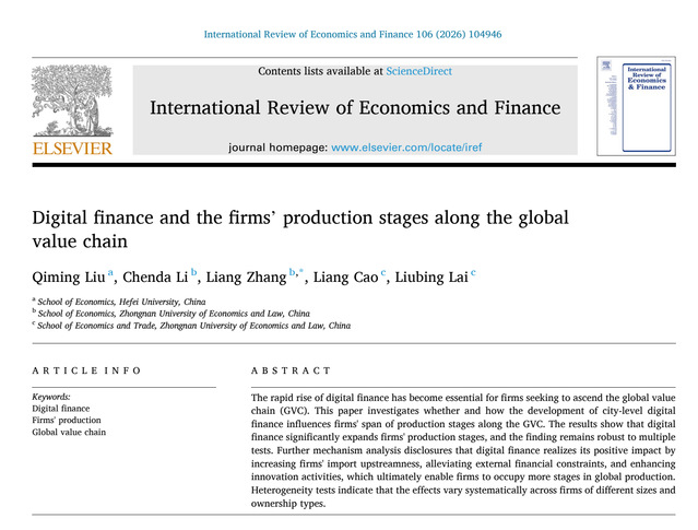 在发表于International Review of Economics & Finance的论文中,研究团队基于全球价值链视角,采用OECD-ICIO全球投入产出数据与中国海关贸易数据库,匹配2011—2016年中国A股上市公司样本展开实证研究,系统检验数字金融对企业全球价值链生产环节跨度的影响效应与作用机制。研究揭示数字金融主要通过提升企业进口上游度、缓解外部融资约束与强化创新活动三条路径,显著拓展企业全球价值链生产环节覆盖范围,并发现该促进效应在大规模企业与国有企业中表现更为突出。本文从微观企业视角丰富了数字金融与全球价值链升级的研究内涵,为依托数字金融推动企业深度嵌入并攀升全球价值链提供经验证据与实践参考,为我国建设数字经济强国、促进数实融合提供政策参考。